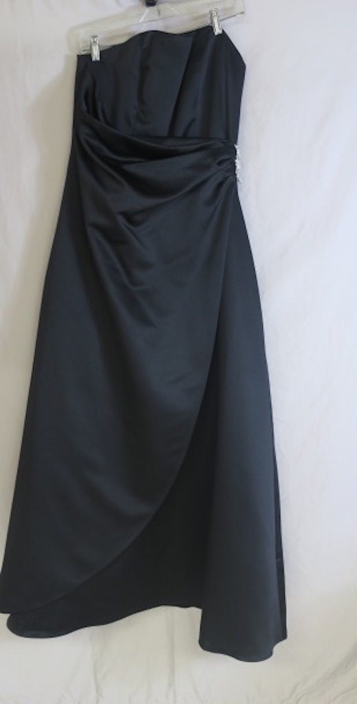 David's Bridal Black strapless Bridesmaid Dress, satin, cinched waist, rhinestone detail, size 10