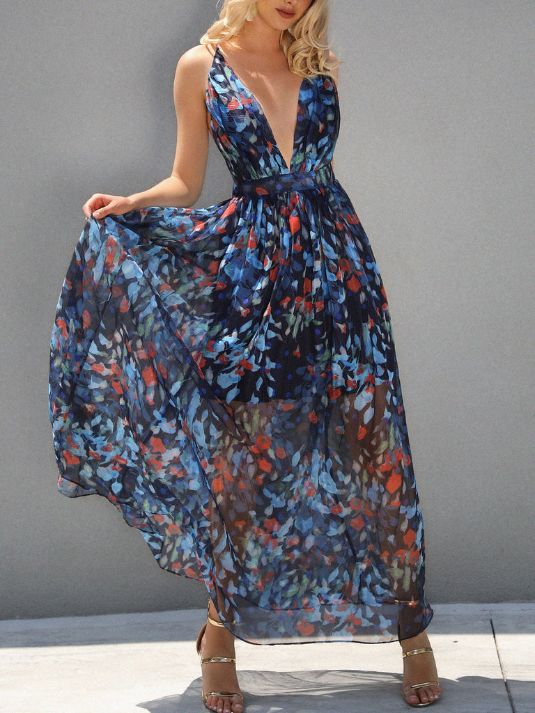 Floral Plunge Halter Crisscross Backless Maxi Dress