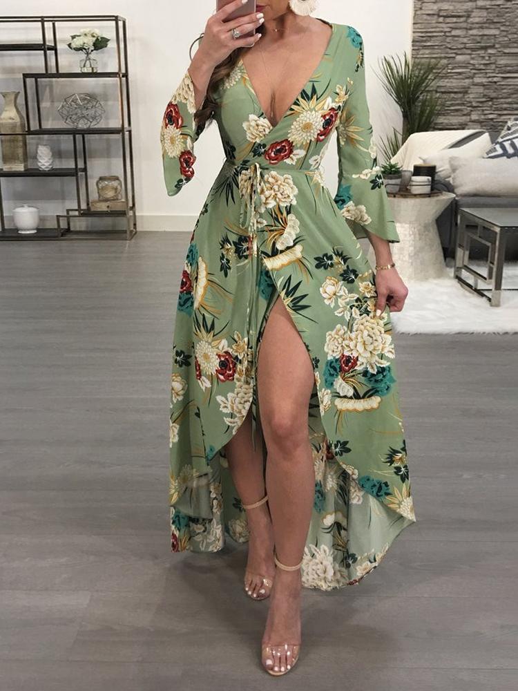 Floral Pattern V Neck Asymetrical Wrap Maxi Dress