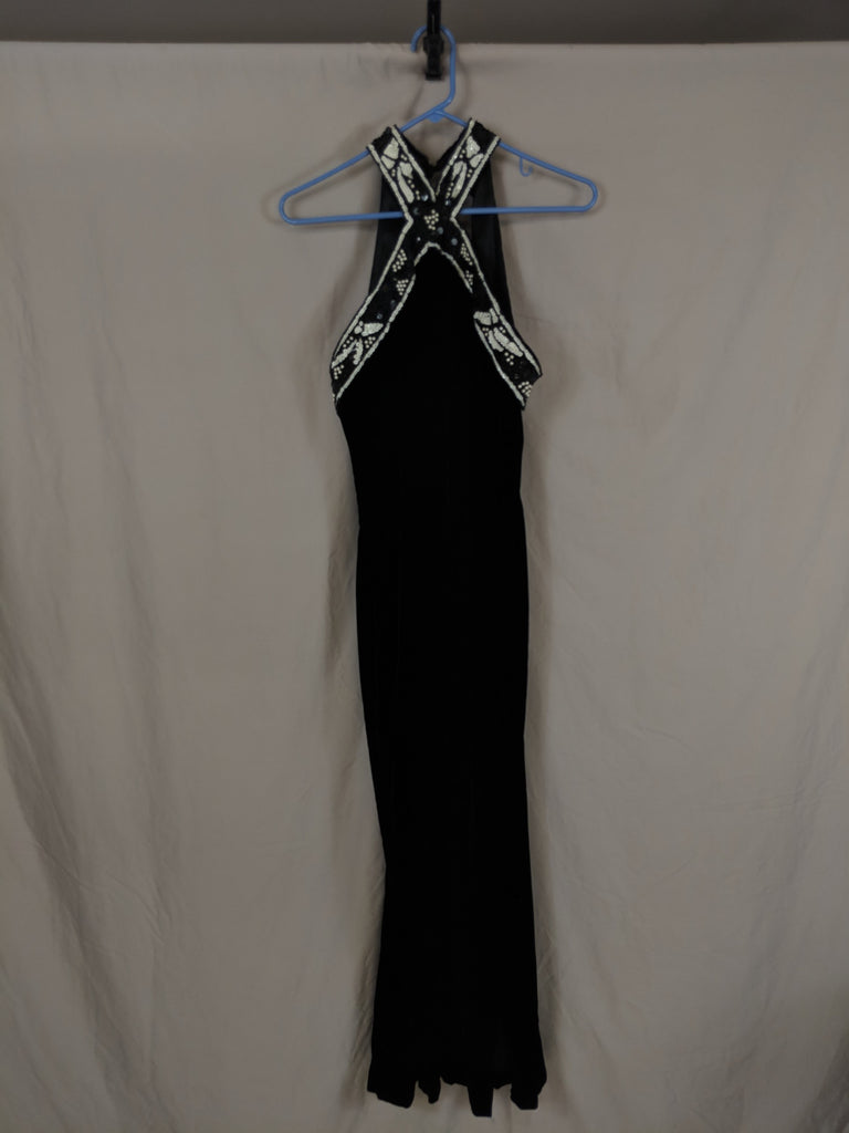 Jessica McClintock Gunne Sax Vintage High neck sequined velvet 90's Prom Gown Dress open back black/white