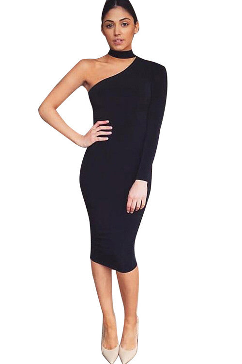 Asymmetric Black Strapless Bodycon Dress Pencil Midi