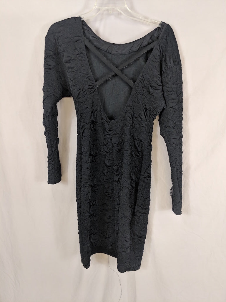 Nuance BodyCon Black Ruched Textured long sleeve mini-skirt dress X cross-back Lace vertical panel 80's/90's glam vintage, size 9