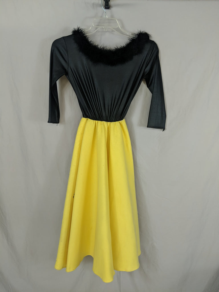 Satin Sock Hop Poodle Dress Rock N Roll Record Pattern, Yellow/Black Feather neck, halloween costume 50's/60's