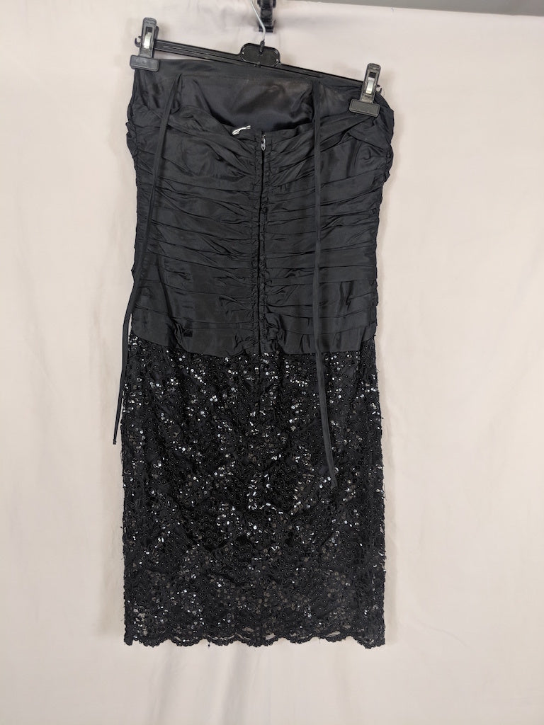 Black Vintage Strapless Ruches Matte Satin Dropwaist Mini Dress, Lace glitter Skirt, Medium. halter strap