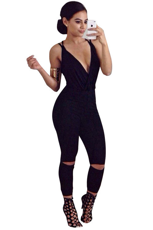 Slim Fit Plunge Backless Slit Black Romper Long Pants