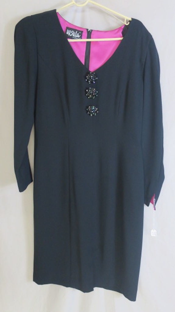Ursula of Switzerland Black V-neck Rhinestone Dress, longsleeve- size 8, pink lining