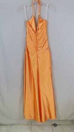 Vintage 90's Jessica McClintock Orange Cream Ruched Halter neck Satin gown long dress rhinestone sequin detail, some discolorations on bottom-pictured, size 6