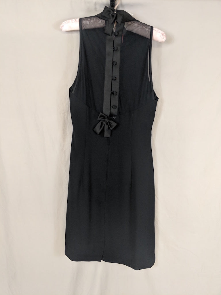 Vintage black high neck short classic cocktail dress-sheer back, bow and button satin detail-small