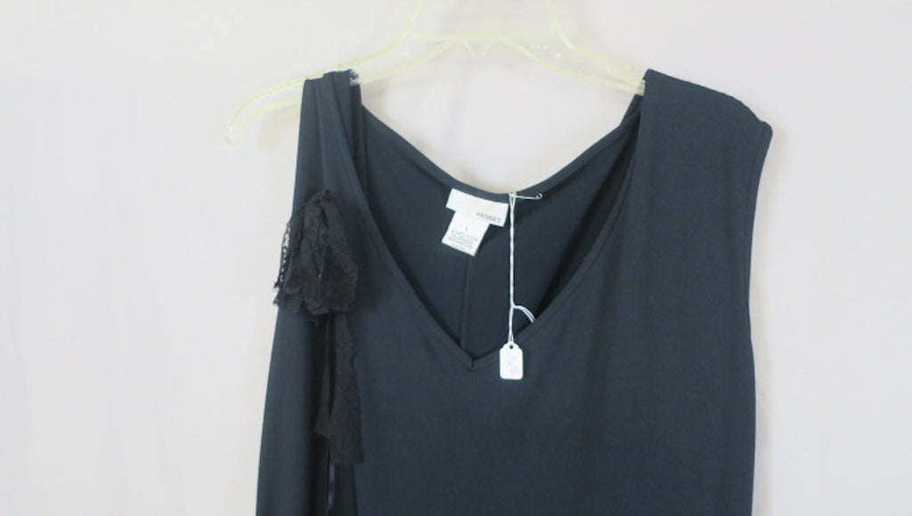 Vintage black Hennes drop waist cocktail dress sleevless, v-neck, ruffled lace hem--Large