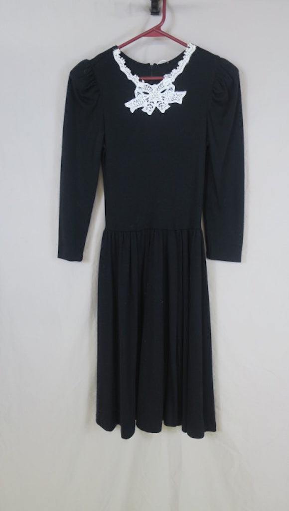 Vintage black Expo Pre Teen modest longsleeve knee length dress White lace collar applique size 10