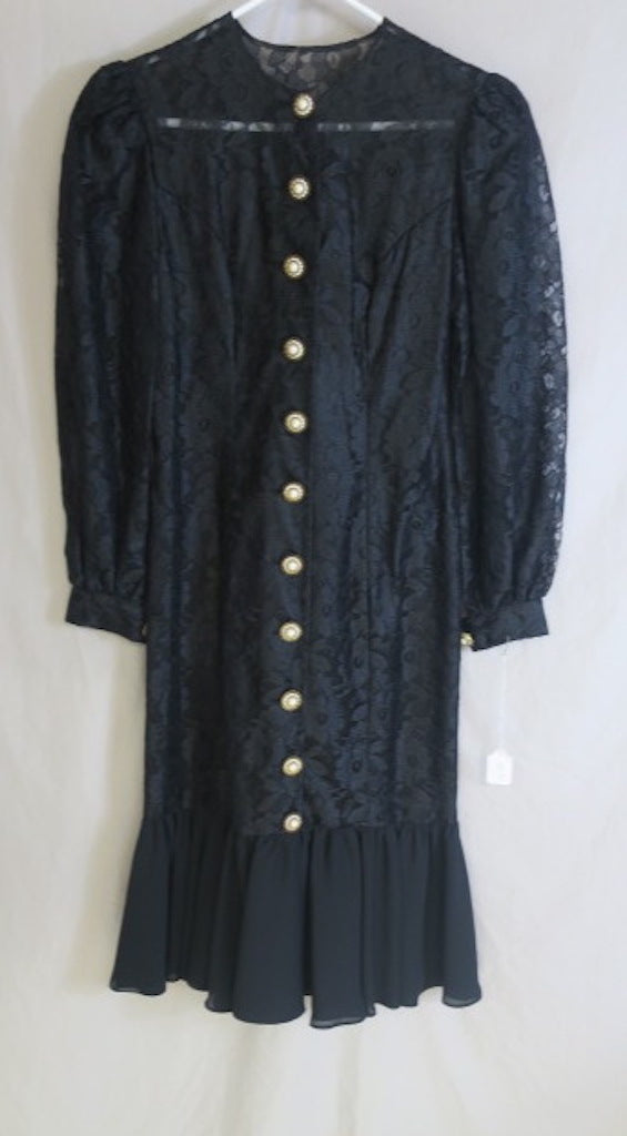 Vintage 80's Modest Longsleeve Lace Dress with Ruffle Flair & Gold/White Button detail