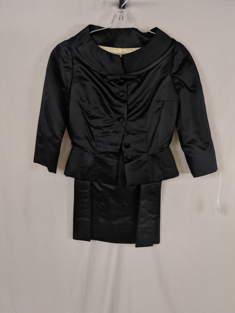 Vintage Black Satin 2-piece 50's knee-length skirt and coat set, wide neck, bow detail, lined-Jackie O Look