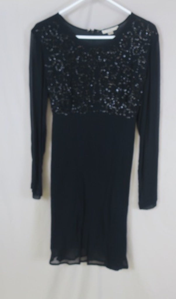 Vintage Karavan black empire waist black sequin dress, knee length, longsleeve-sheer-medium