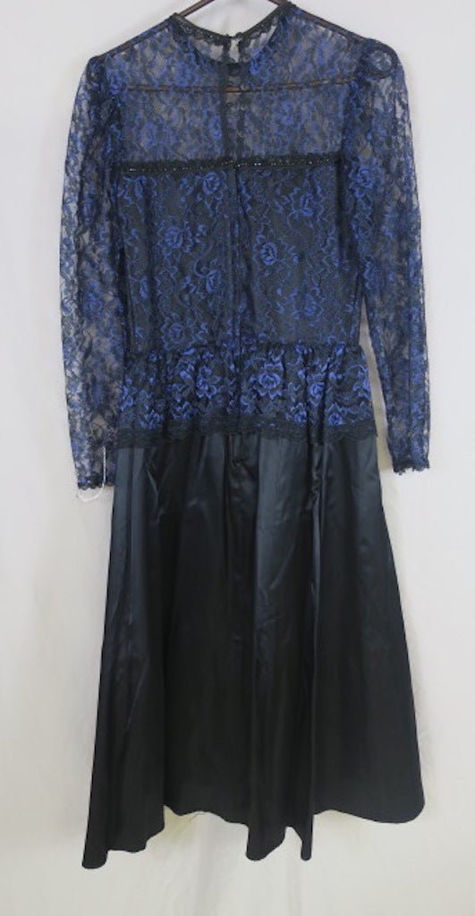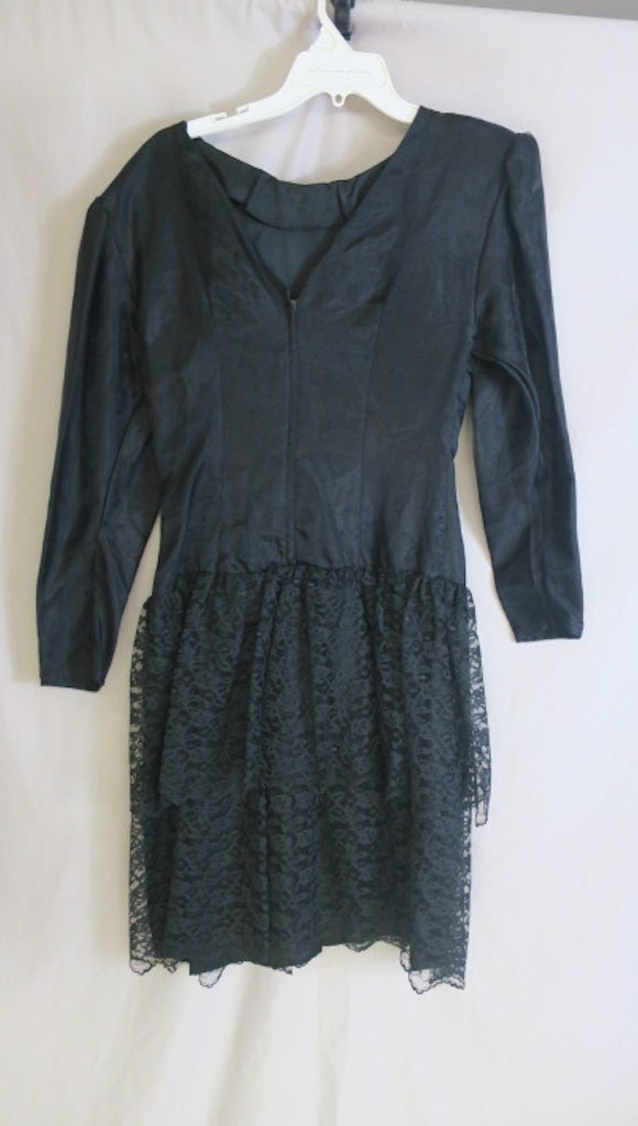 Vintage Black longsleeve 80's cocktail prom dress with layered lace skirt, rosette accent