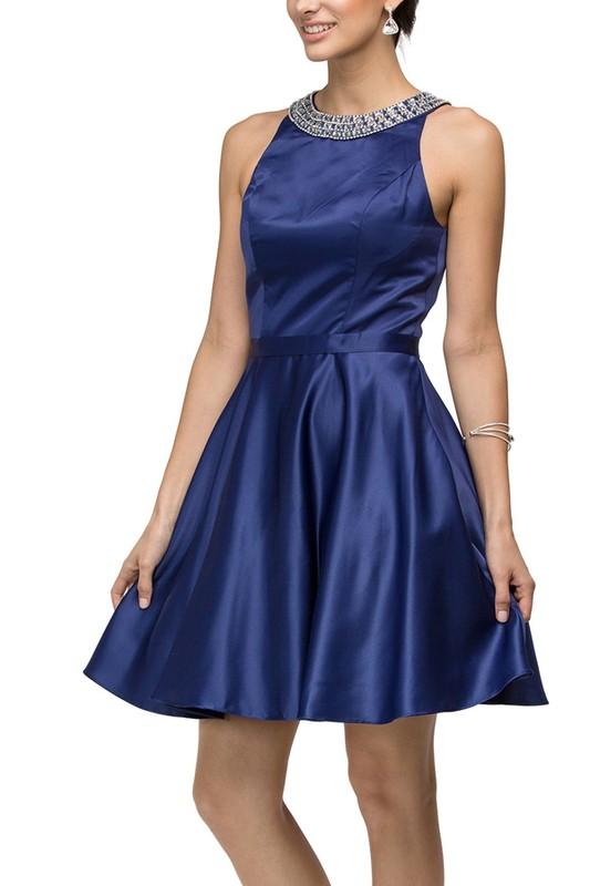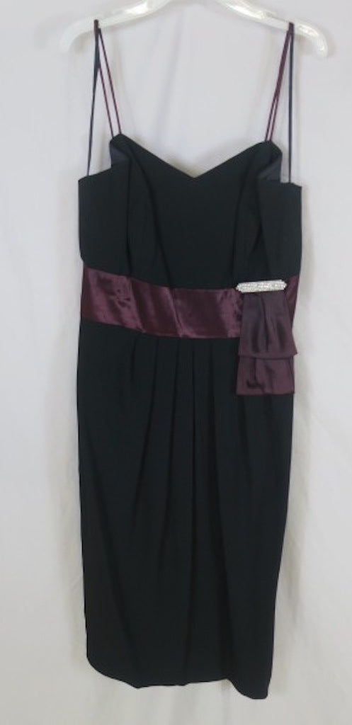 Vintage Rimini 50's black matte satin knee-length dress, size 10, deep purple satin waist rhinestone accent. Saks Fifth Avenue brand