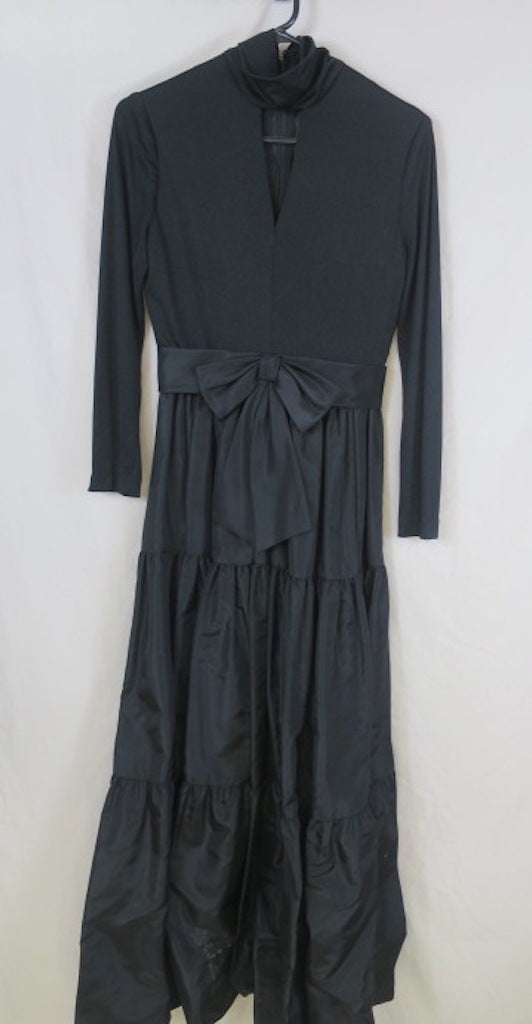 Vintage Sandra Sage High neck black long sleeve floor length gown dress, medium, cutout detail, 40's/50's-modest