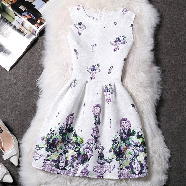 Vintage Womens Summer Dresses 2016 Summer Elegant White And Black Floral Sleeveless Dress Ladies Casual Short Ball Gown Dresses