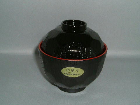 Yamanaka-nuri soup bowl w/lid, outside black inside red, tortoise shell pattern, d3.74 x h3.74 in