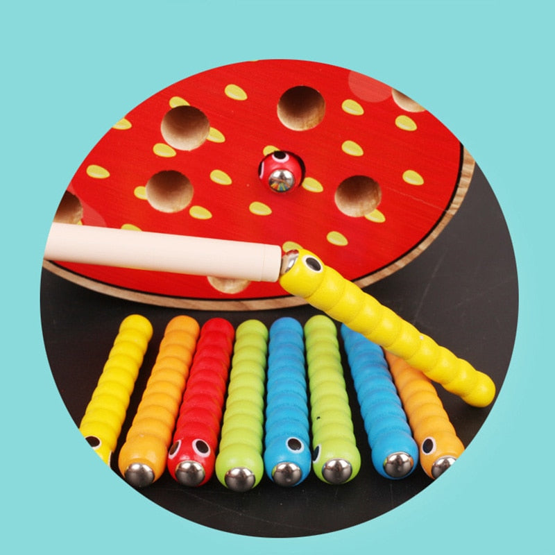 A fun and exciting Catch the Worm game. Hide the colorful worms in the strawberry or apple, and use the rod with magnet on the end to catch the worms. For extra challenge, return the worms to the holes while they are dangling from the magnetic pole. This game is a creative way to encourage hand-eye coordination and develop fine motor skills, and build manual dexterity as your child carefully positions the magnets together to "catch the worm".