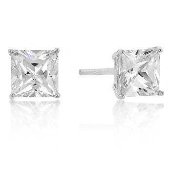 Genuine Rhodium Plated 6mm Princess Cut Sterling Studs with Clear Princess Cut Cubic Zirconia Polished into a Lustrous Silvertone Finish