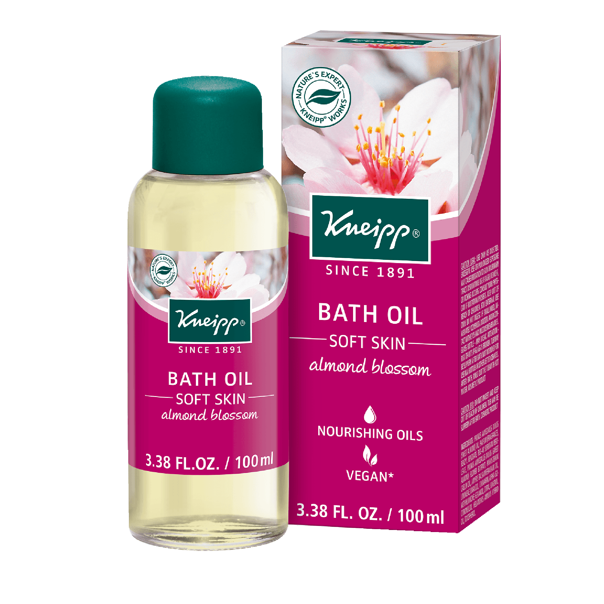 The lightly scented Kneipp® Almond Blossom Soft Skin Herbal Bath Oil conditions and softens your skin with Almond Oil and Patchouli Oil. Containing 94% pure Almond Oil, this Bath helps strengthen skin’s natural protective barrier and leaves skin silky smooth and luxuriously supple. Almond Oil is known for its high content of essential fatty acids as well as Vitamin E. It helps regulate skin’s natural hydration to leave your skin soft and beautiful.