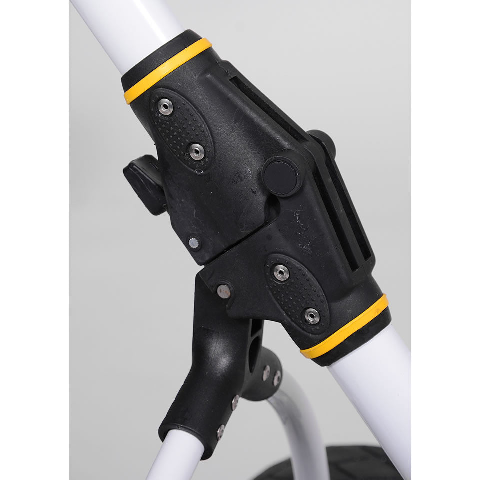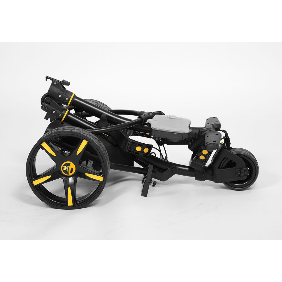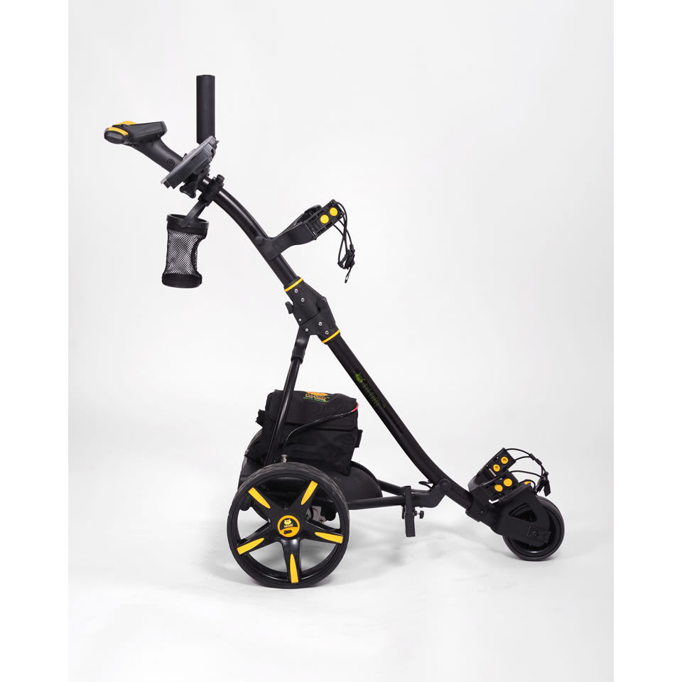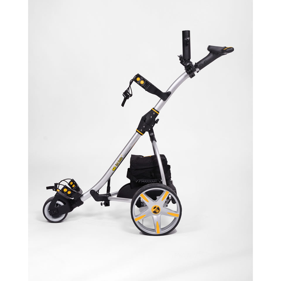 The 2017 Bat Caddy X3 Golf Caddy is a long term proven, highly innovative manually (non remote) controlled electric battery powered golf caddy with a lot of features, functionality and performance at world-class quality and very competitive pricing. The X3 design has been modeled after the successful concept of our popular and proven flagship remote controlled X3R model. It features a lightweight high tech aluminum frame with an easy-to-use one click/one piece set up and fold design, a powerful quiet 200 Watt motor, a seamless rheostat speed control with battery charge indicator, timed advance distance (10, 20, 30 meters/yards), cruise control function, USB port and a more powerful, long-lasting 33Ah sealed lead acid battery with the option to upgrade to a 35Ah remote caddy batteries or now also a super light, compact and environmentally friendly Lithium battery. The trolley can also be easily pushed without battery power, so you will never be stuck out on the course. The X3 differentiates itself from the X4 by its larger, stronger battery, the additional timed advance function (automatic 10, 20 30 yards advancements), USB port, and the elegant S-shape frame designed after its bigger remote controlled brother, the X3R.