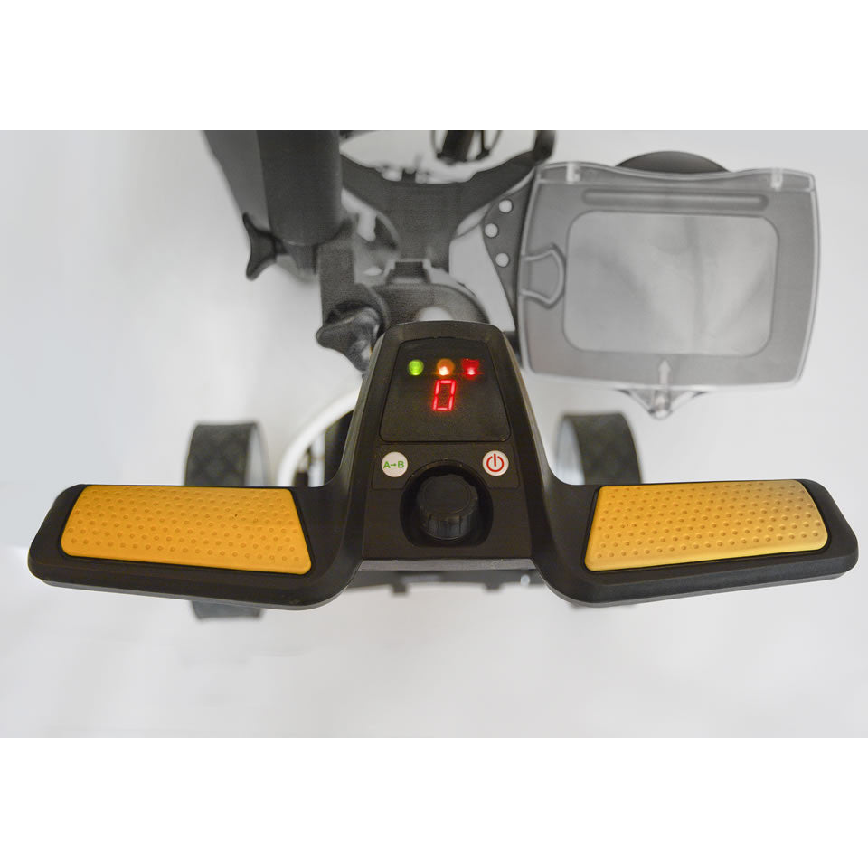 - Handle - The newly designed T-Handle controls include a 3 LED battery charge indicator, an On/Off button, the timed advance function controls, cruise control function, On/Off button, as well as the manual seamless speed control rheostat button. This handle emphasizes the high tech design of the X3R and gives you total control over the caddy at all times.