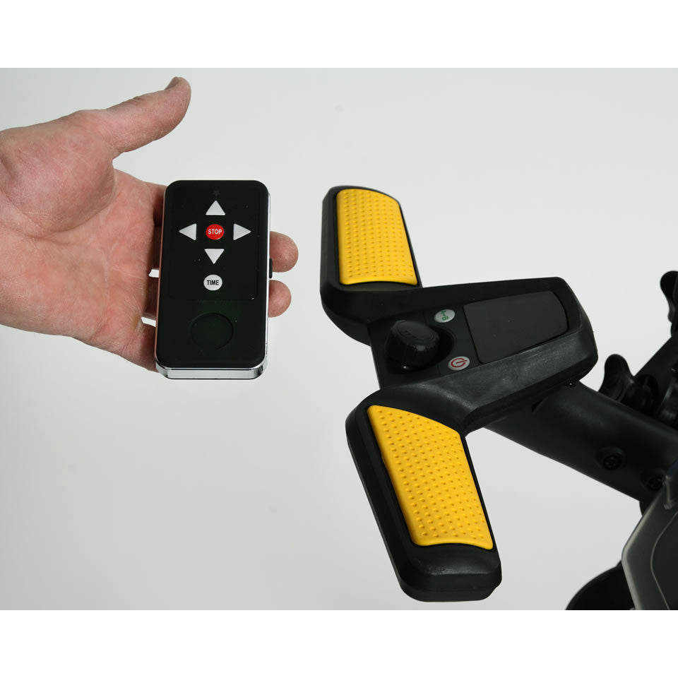 - Remote and Manual Speed Control - Forward, Sideways AND REVERSE! - You set the pace up to an amazing 80-100 yards (meters) range (10-20 yards operating range recommended)! Note: our remote controls have the official authorization for radio frequency emitting devices from the Federal Communications Commission (FCC). Beware of caddies which are not authorized. Seamless speed adjustment on both the handle and remote control ALSO: Features a timed advance function for 10, 20 and 30 yards/meters controlled through both remote and handle.