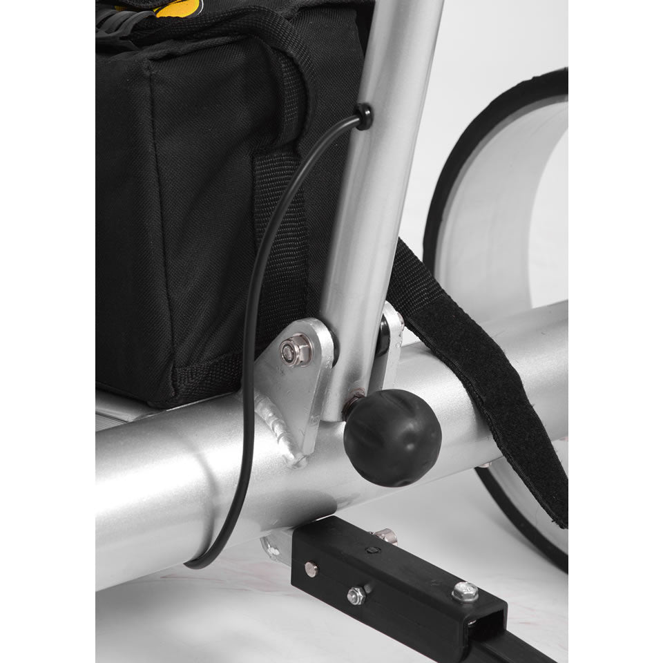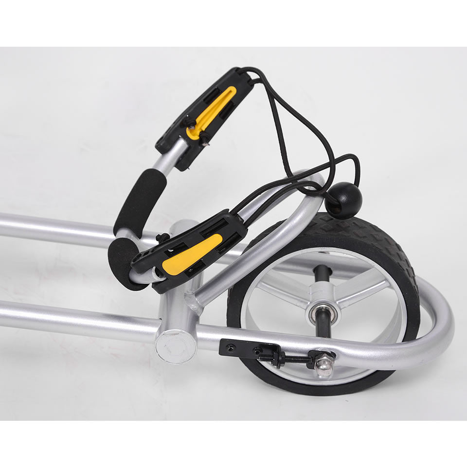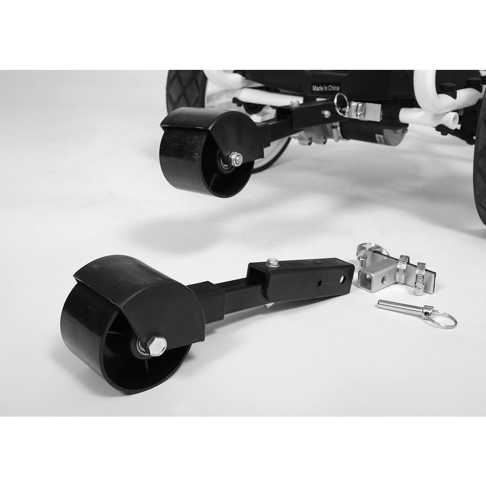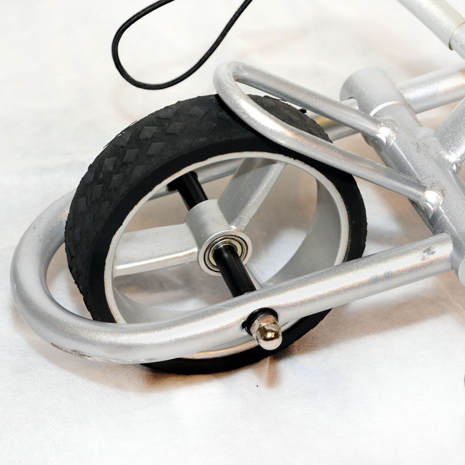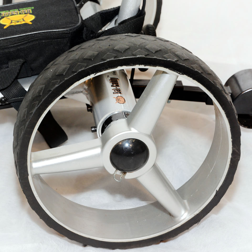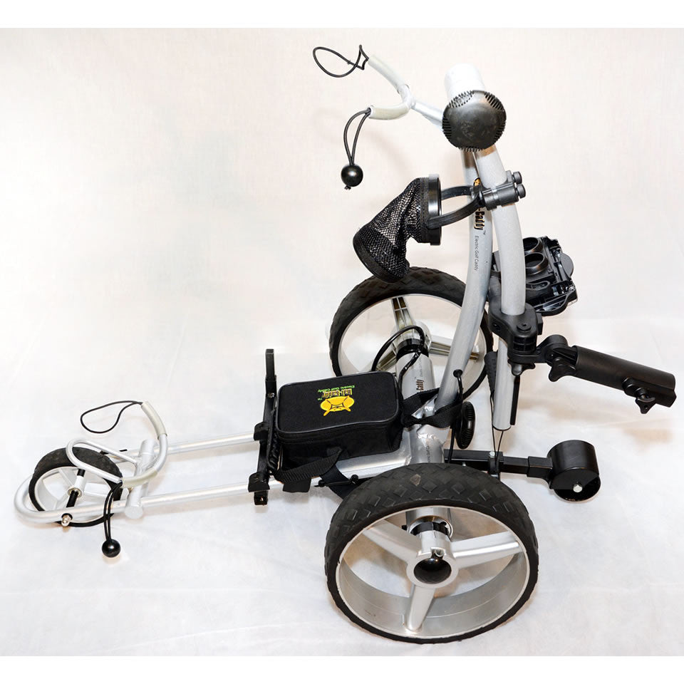 - Anti Tip Wheel: A standard removable rear stabilizer wheel to prevent tipping over on hills is included. We now also offer an upgrade option to our new "Mountain Slayer" Deluxe anti-tip wheel which is almost a 4th wheel giving the caddy added stability on very hilly courses. Also recommended for lithium battery caddies, because the reduced battery weight moves the center of gravity up.