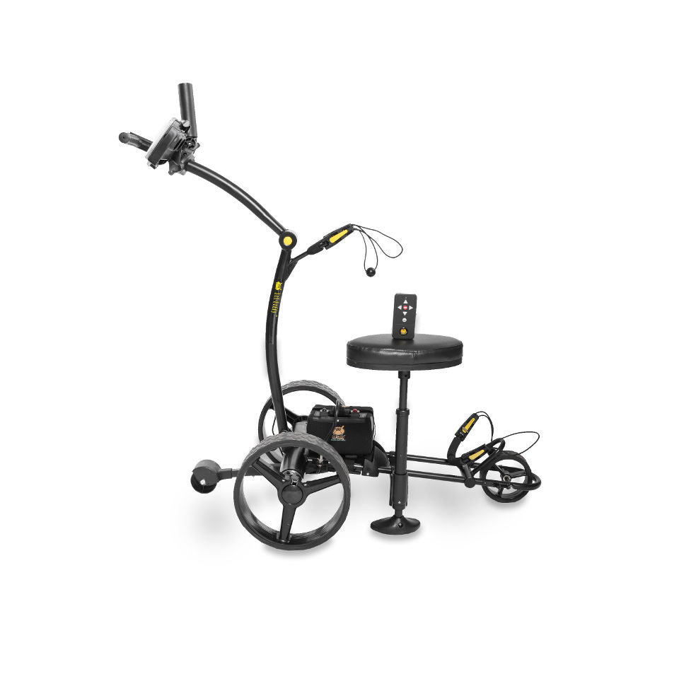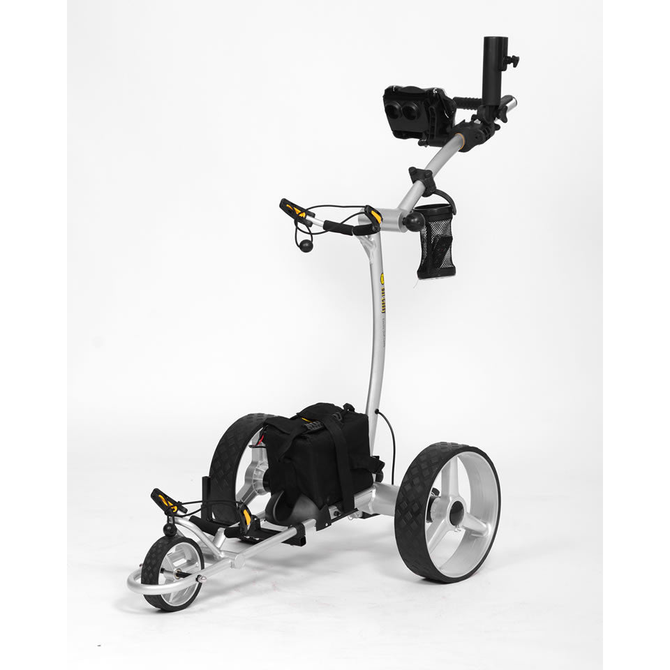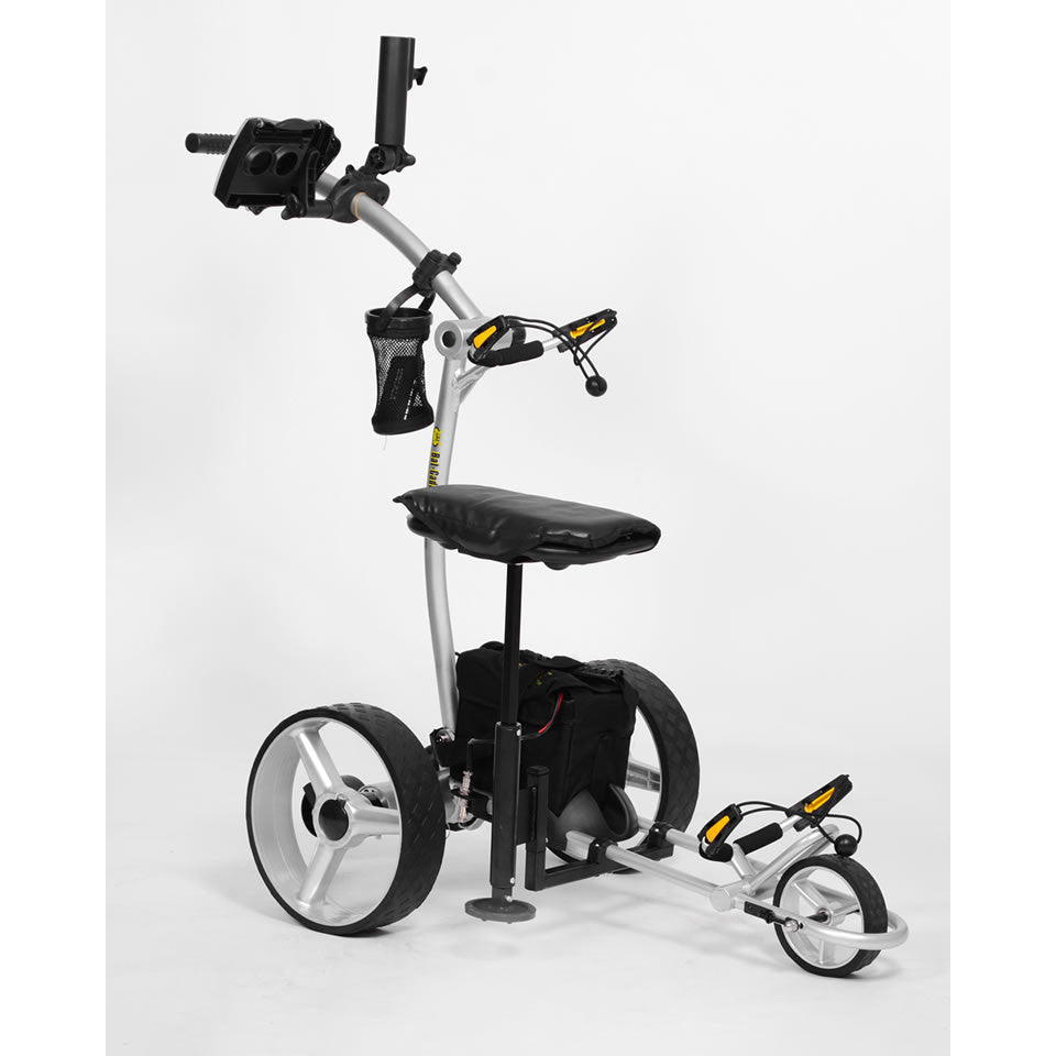 The 2017 Bat-Caddy X4R™ is one of the most innovative and unique remote controlled caddies and probably the best selling remote controlled motorized caddy in North America. In its 5th model year it features an amazingly lightweight high tech aluminum frame weighing in at only 24 lbs (11kg). It has an easy two step, two click set up design folding into a package that is smaller than most regular push carts. It is propelled by two powerful independently controlled quiet 200W motors, a wide range FCC authorized remote control system which gives you full control up to 90-120 yards. It comes with a powerful, long-lasting 35Ah sealed lead acid (SLA) battery or with the super light, compact and environmentally friendly Lithium(LI) battery. The trolley can also be operated manually with a seamless rheostat and cruise control and can be easily pushed even without battery power, so you will never be stuck out on the course. The X4R differentiates itself from the X3R by the innovative, European inspired frame design with adjustable handle height, its slightly more compact size, as well as its remarkable agility. Both caddies share the same, proven key components, such as motors, batteries and electronic and remote control systems.