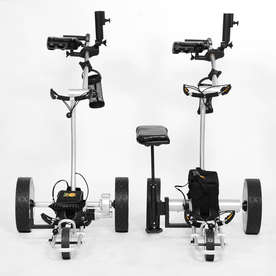 - Powerful, Quiet, Fast, Independent Dual Dircet Drive Motors - The X4R features a pair of powerful and quiet 200 Watt DC electric motors, inconspicuously hidden and protected in a small aluminum tube. We have eliminated problem causing and aesthetically unpleasing gear boxes with direct drive motors. Most our competitors are still using obsolete designs with gear boxes. If you did not know it, you would not know the motors are there! Also the caddy will master any hill (30+ degrees climbing ability) and reaches a top speed of 5.5 mph+.