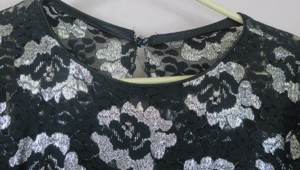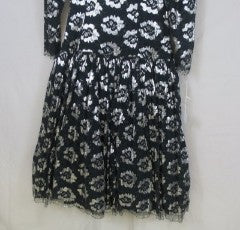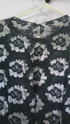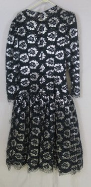 Black and Silver Rose Print Lace Dress Puffy Hem Long Sleeve Vintage 80's