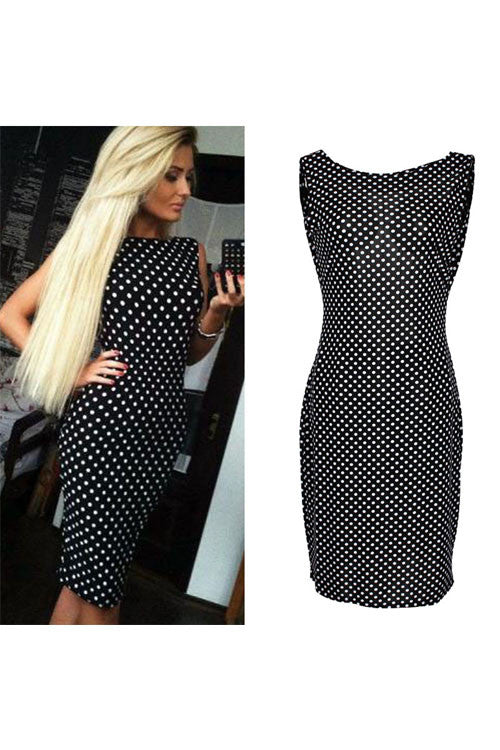 Black Elegant Sleeveless Knee Length Bodycon Dress with white polka dot is vintage and stylish. The material is stretch and soft, snug to wear. It show off your slim silhouette extremely. It is high waist design and backless which shows your beauty back, it is sexy and elegant. You will create a traffic dams.