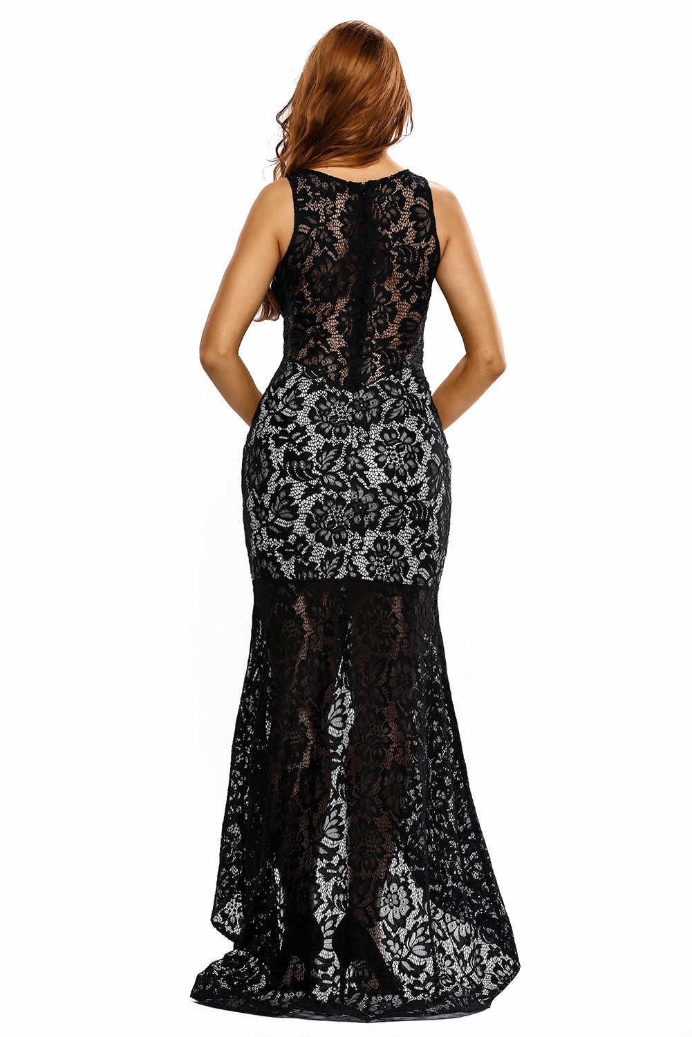 Show off every one of your gorgeous curve in this sleek form-fitting lace party dress. The sheer mesh lace fabric creates a super glamorous silhouette with soft lined mini-dress bodice, and streaming down to the fishtail that drapes beautifully into the sheer lace flounce. A sexy, yet classy, lace evening gown that is sure to land you on everyone's best dress list.