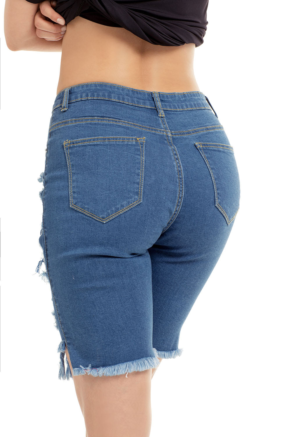 Mid rise bermuda denim shorts with extreme cutouts and distressing across the front. Fraying on the bottom with an eye-catching camo patchwork on the big hole cutout. Traditional 4 pockets with button and zip fly closure. Pairs well with oversize tops, crop tops and basic t-shirts.