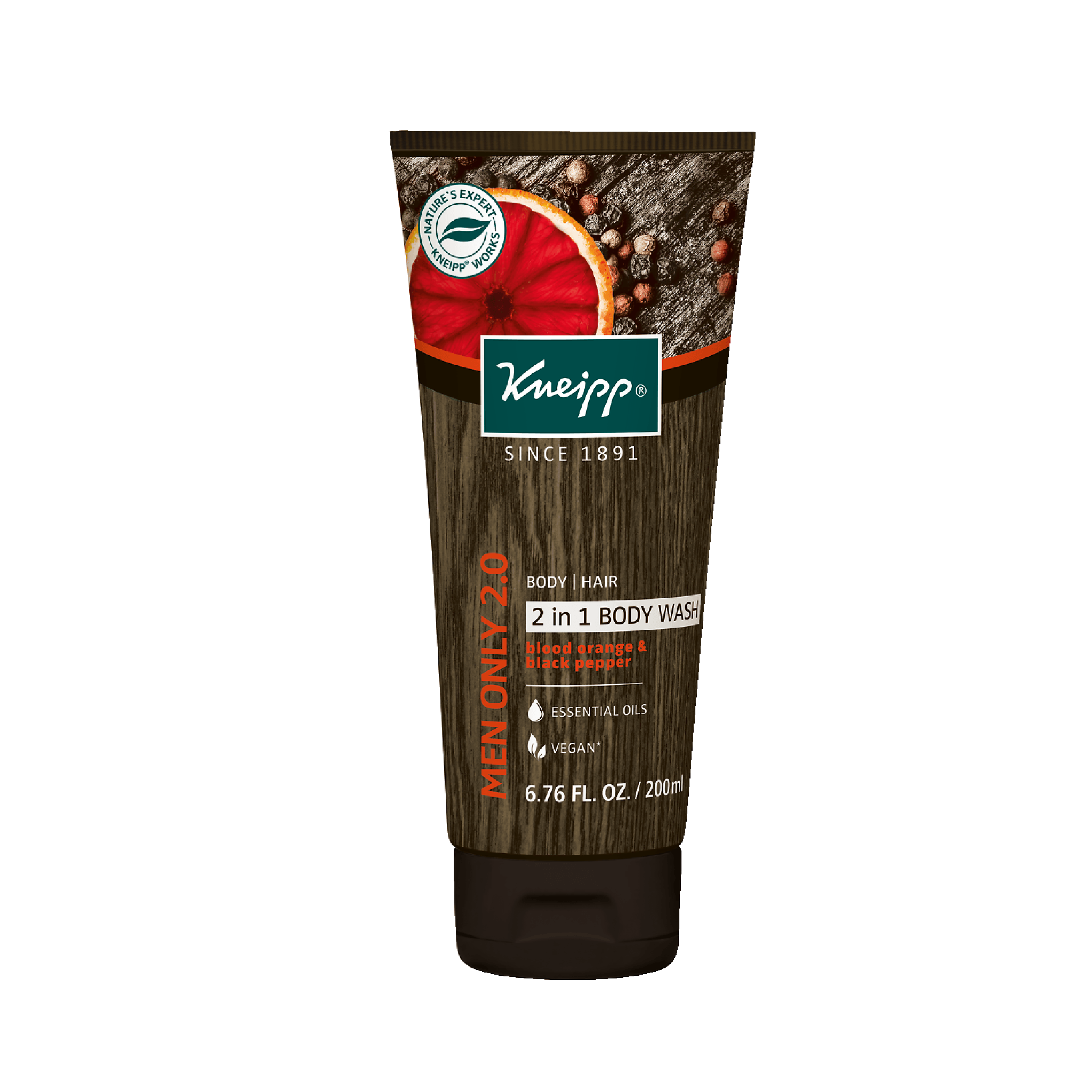 The KNEIPP® MEN'S BLOOD ORANGE & BLACK PEPPER BODY WASH - "MEN ONLY 2.0" provides body care for men with expertise in nature. This soap-free and pHbalanced formula cleanses gently, leaving skin soft and supple. The plant-derived conditioning formula improves the feel of the skin during and after showering. One study1 additionally confirms that the skin is prevented from drying out. 1 Experimental study: Measurement of skin moisture after use.