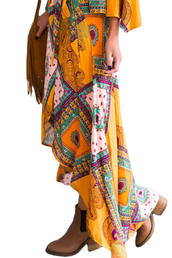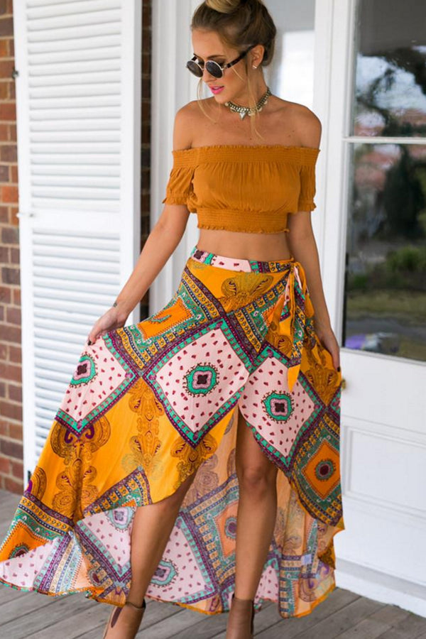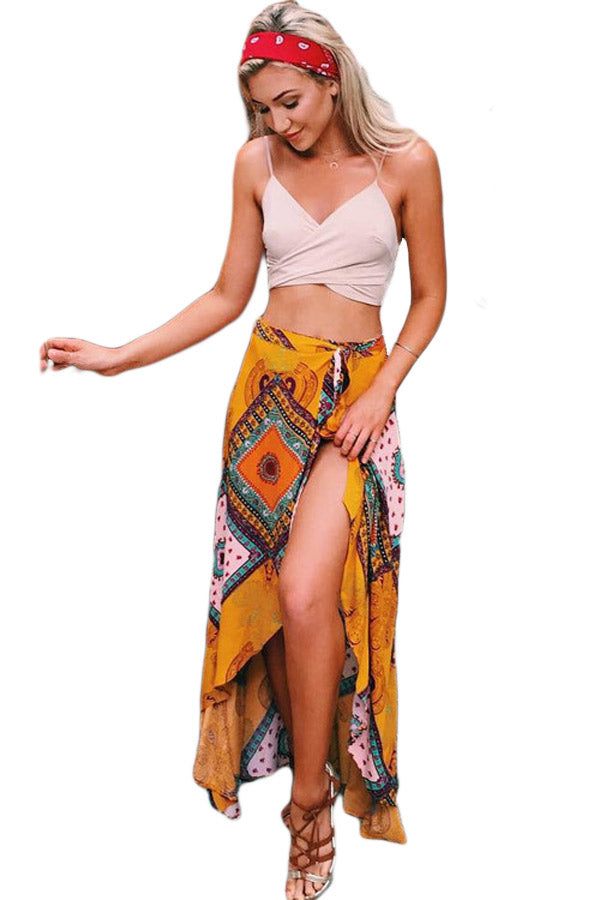 Boho Dream Tie Waist Tribal Print Asymmetrical Maxi Skirt
