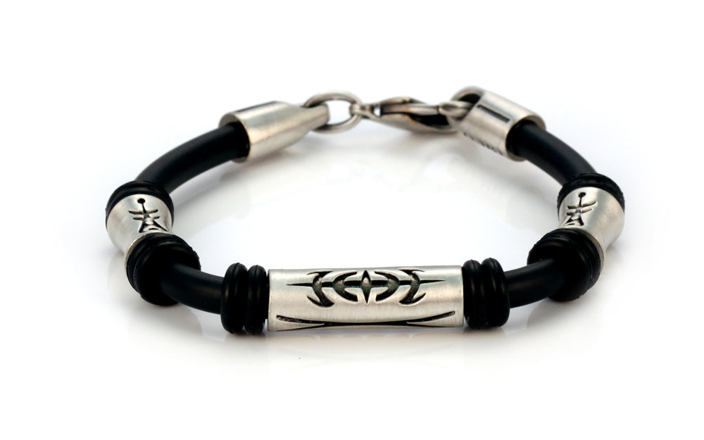 This bracelet is made from rubber band and solid brass which has been plated with pure silver, oxidised, hand sheened, then coated with a transparent protective layer to extend the wear life .