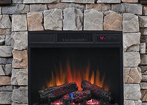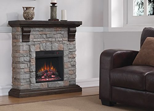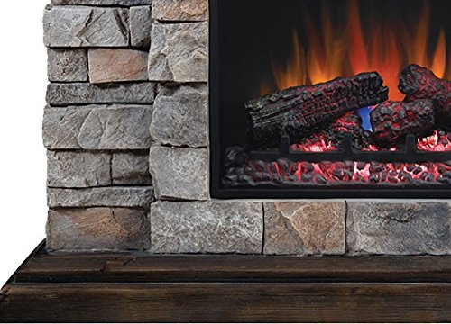 Add instant character to your living space with this rustic stone wall mantel with a ClassicFlame 18II332FGL 18 Inch infrared quartz electric fireplace. Its compact design allows for placement in all size spaces from the living room to the bedroom. Planked wood detail top and base bottom add to its charming design. The infrared quartz heat helps to maintain the natural humidity within the air, resulting in moist, comfortable heat without drying out the room's air. The electric fireplace insert provides supplemental zone heating for up to 1,000 square feet and features realistic flame effects that dance over a log set and ember bed. This fireplace features Spectrafire flame effect technology which provides the most realistic flames effects available. Spectrafire offers 3 blue and 3 amber flame effect brightness settings that can be set to get the look of modern gas fire or of a cozy wood burning fire. These flame effects can be used with or without heat for year-round ambiance. You can conveniently control these and the other functions from the comfort of your favorite chair with the included remote control. Essential safety features will put you at ease when using this electric fireplace. It plugs into any standard outlet and the screen-front stays cool to the touch for worry-free use around kids and pets. It’s equipped with patent pending Safer Plug fire prevention technology which monitors the temperature of the plug and will turn off the insert if overheating is detected. It features convenient programmable automatic timed shut off and adjustable thermostat. Allowing you complete command over a multitude of options while providing quality heat, this electric fireplace offers an unsurpassed experience.