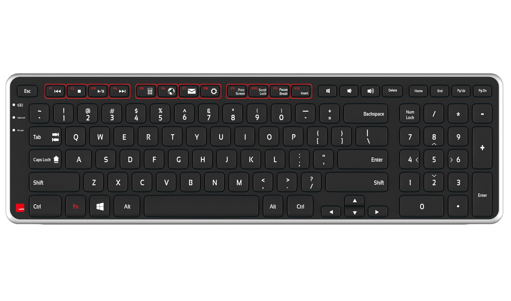Indicator lights for battery level, caps lock, and function lock