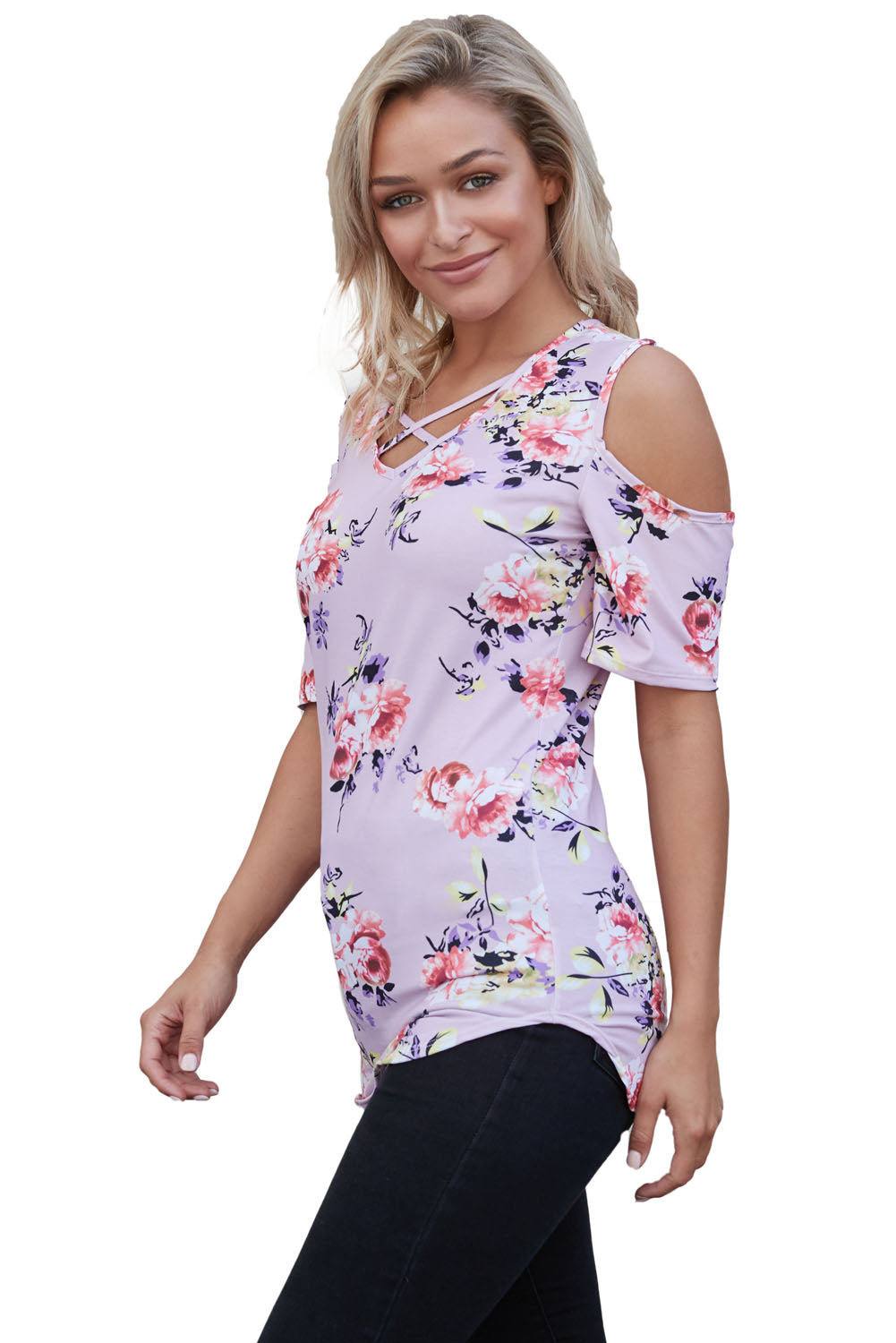 The Floral Print Crisscross Neck Cold Shoulder Top is a classy top to wear on those days you feel like sprucing things up. The cold shoulder short sleeves are an elegant look that looks even better when it's coupled with the criss cross neckline. The floral patterns freshen up the top and feature beautiful colors. Do the best thing and order the Floral Print Crisscross Neck Cold Shoulder Top.