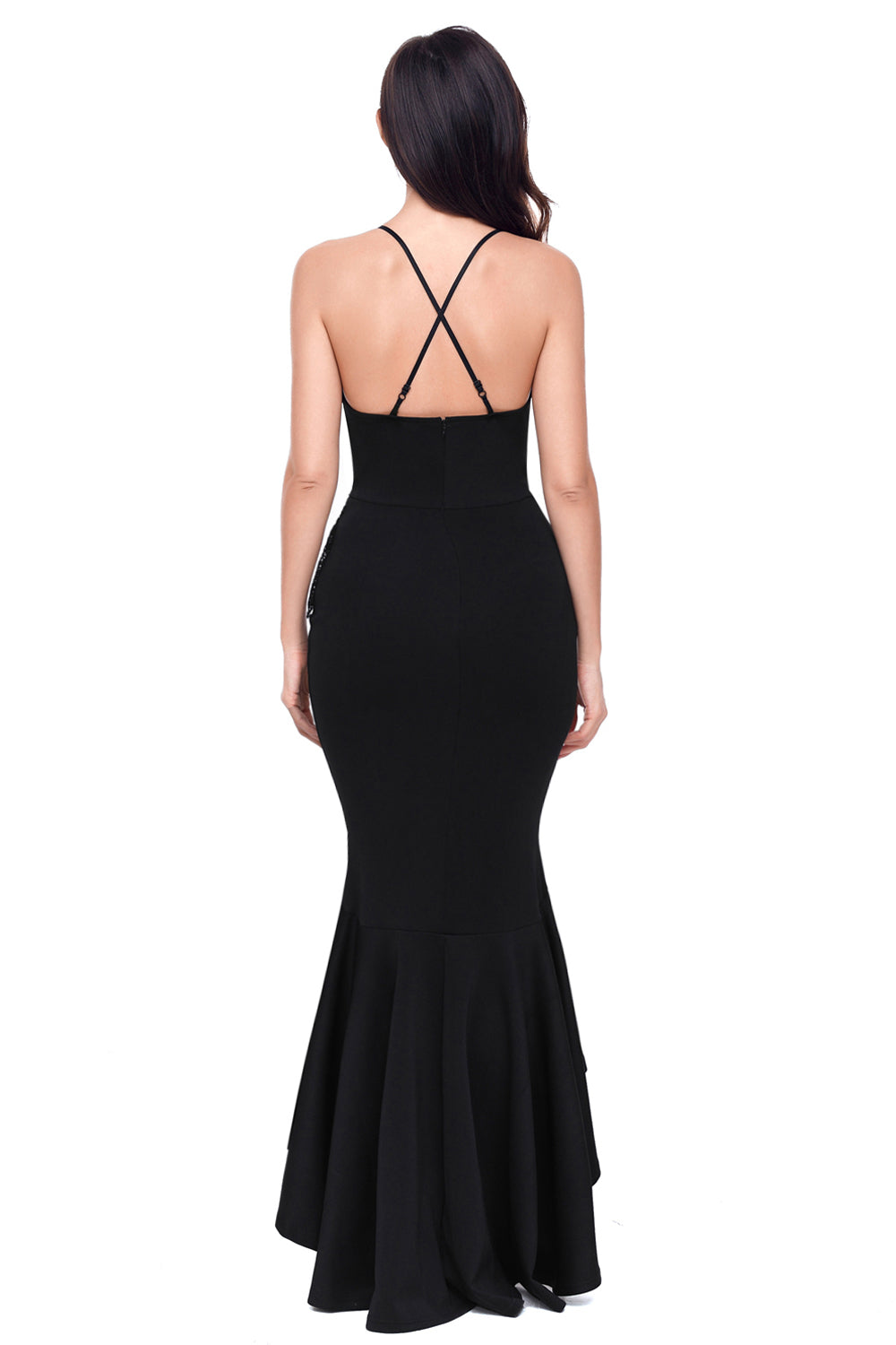 This new party dress offers elegance and flair that empowers women of all ages and silhouettes to feel and look their best. Designed with a subtle mermaid silhouette that hits the floor in a hi-low train, this unique dress show the feminine allure with floral lace, sexy v neckline, and crossed spaghetti straps detail the open back.