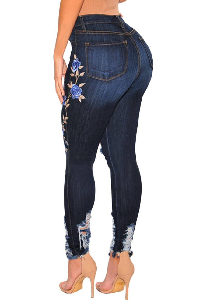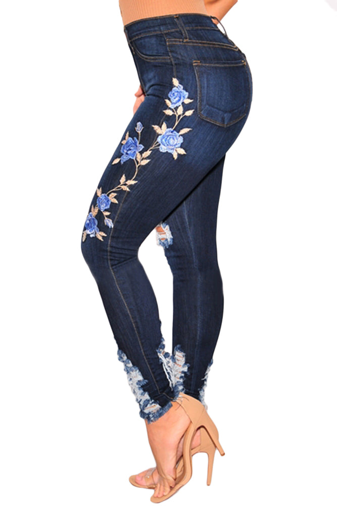 Dark Denim Embroidered Floral Destroyed High Waist Skinny Jeans
