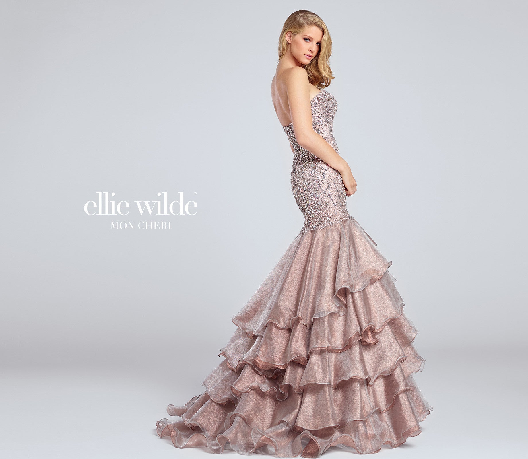 Strapless organza trumpet gown with soft sweetheart neckline, dropped waist bodice encrusted with hand-beading, multi-tiered skirt with slight train. Removable straps included.
