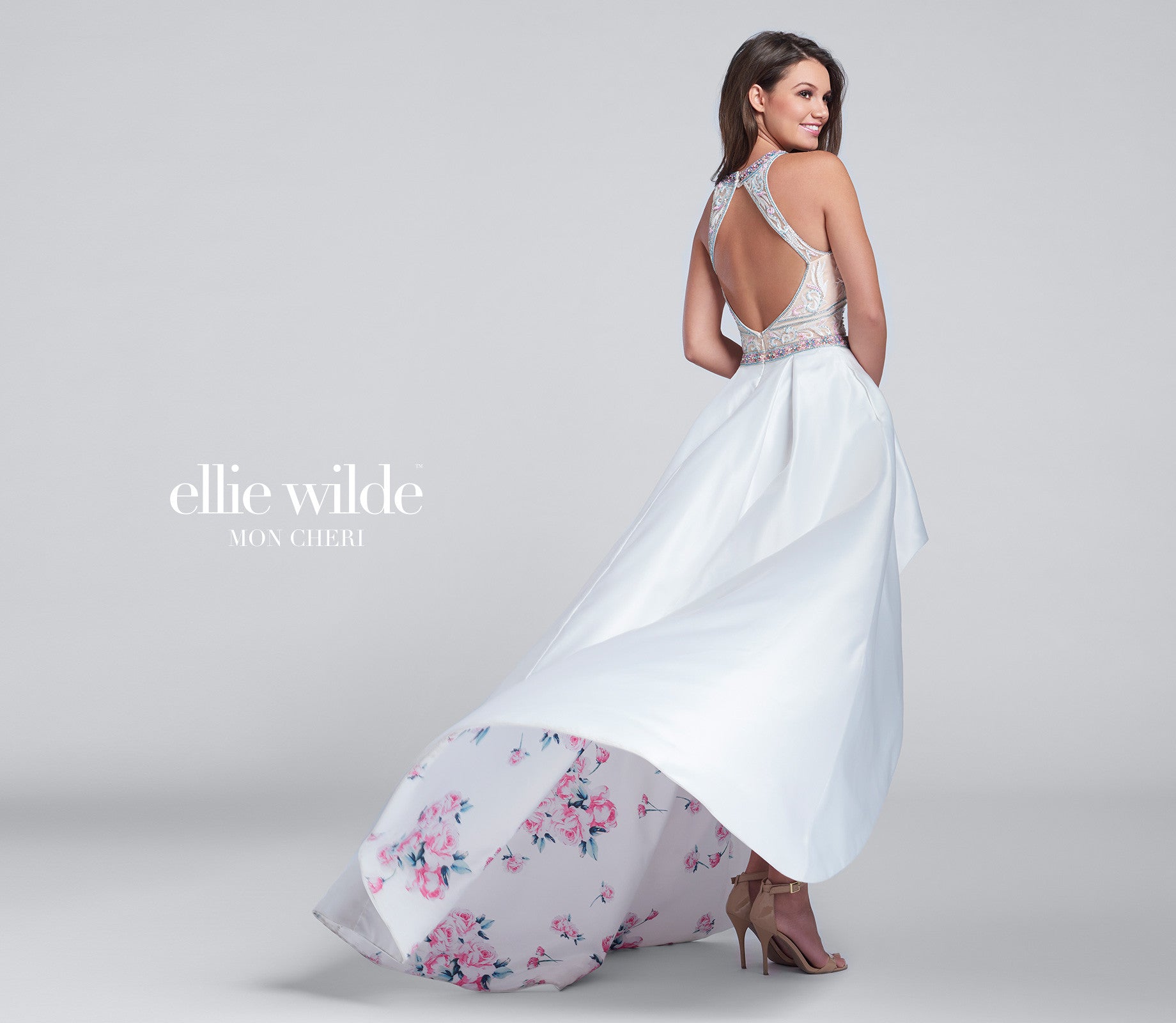 Sleeveless satin A-line gown with floral embroidered tulle bodice, hand-beaded round neckline and waistband, large keyhole back, high-low skirt reveals printed lining on inside of skirt, side pockets, sweep train.