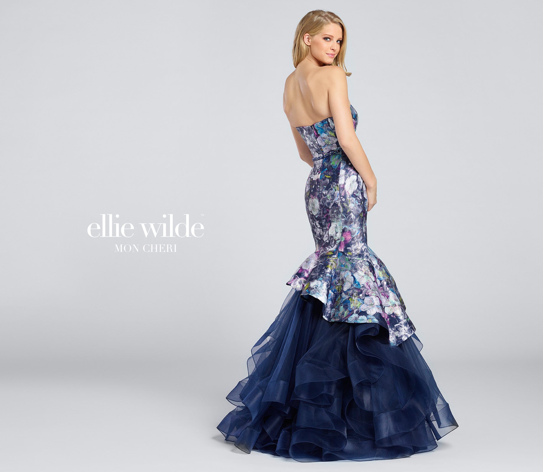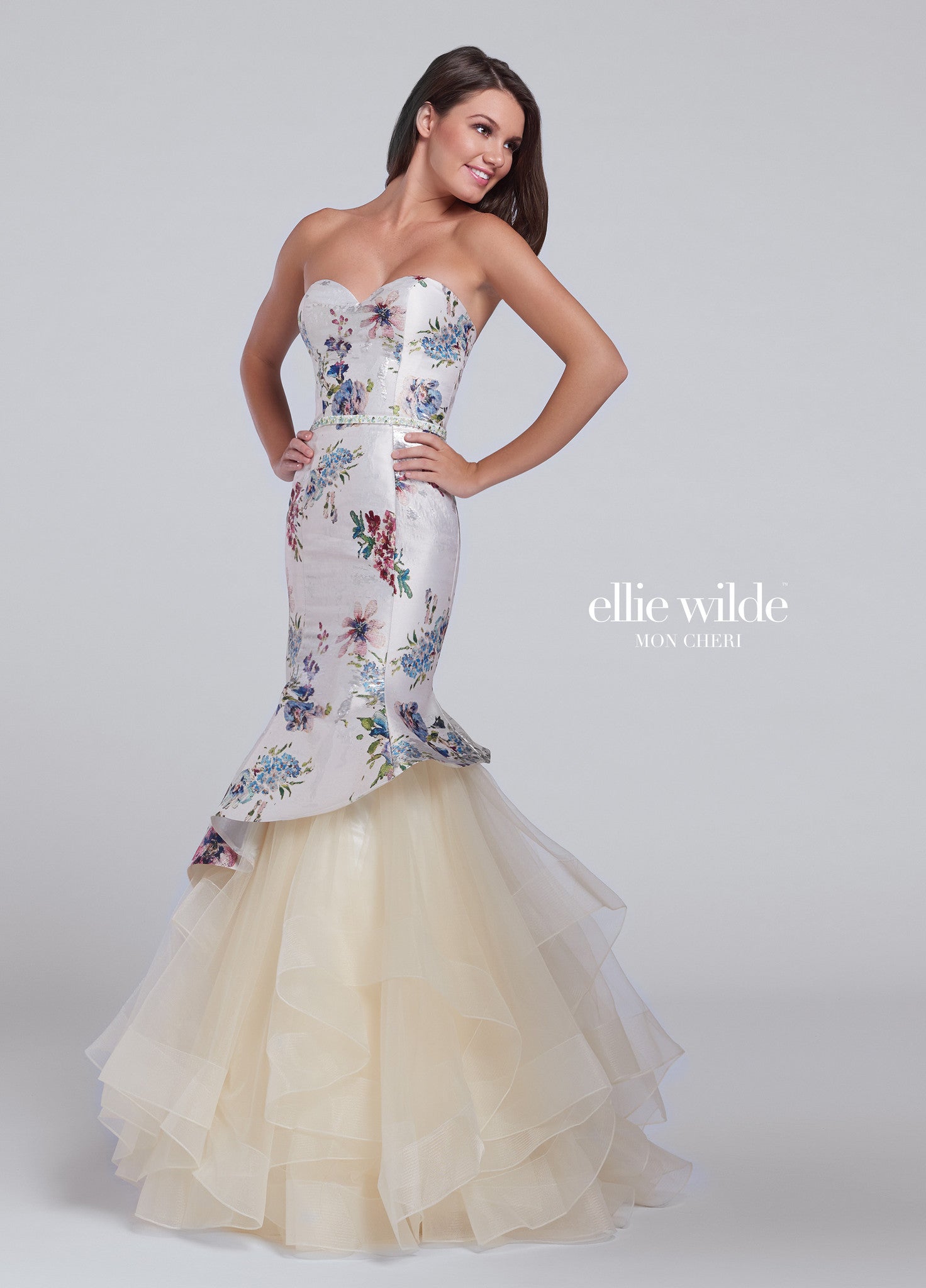 Strapless printed novelty jacquard mermaid gown with sweetheart neckline, hand-beaded natural waistband, asymmetrically dropped waistline, asymmetrically layered tulle underskirt with horsehair trim. Removable straps included.