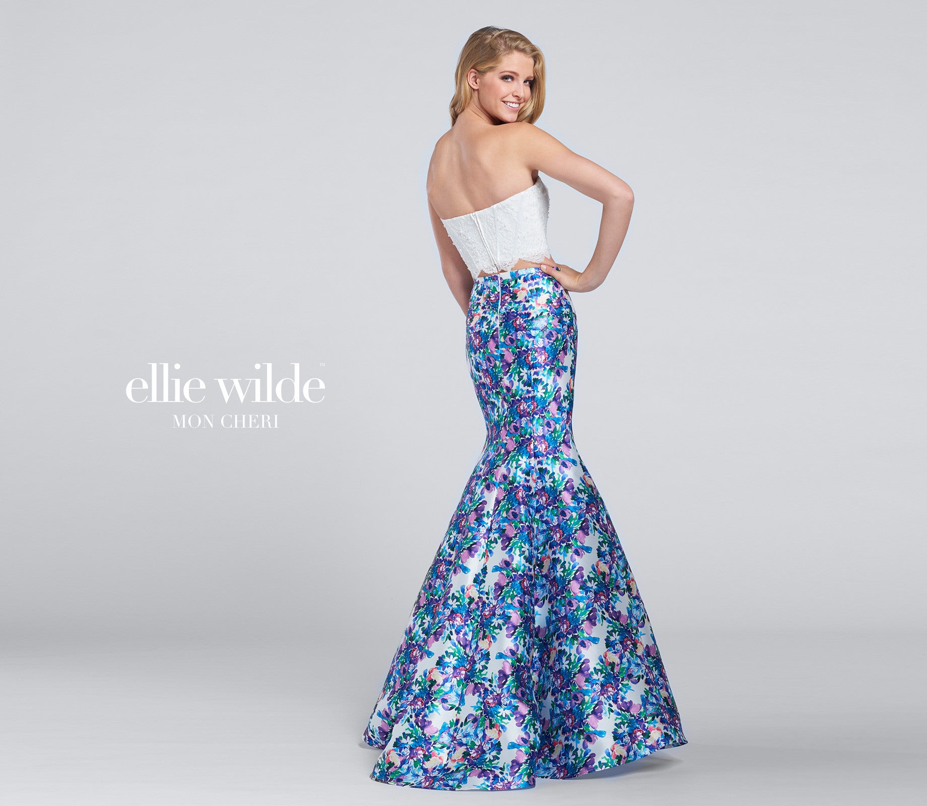 Two-piece lace and exclusive print Mikado dress set, strapless bustier-style scalloped lace cropped top with sweetheart neckline, high waist printed Mikado mermaid skirt.