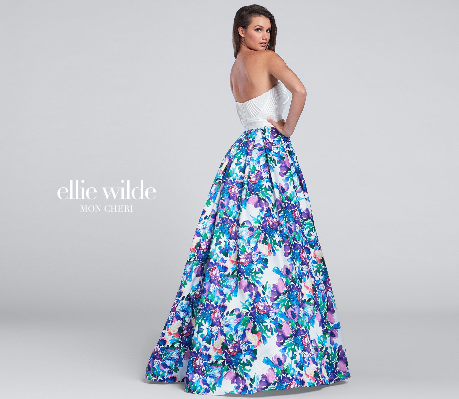 Strapless exclusive print Mikado A-line gown with soft sweetheart neckline, directionally pleated solid Mikado bodice, box pleated skirt with side pockets. Removable straps included.