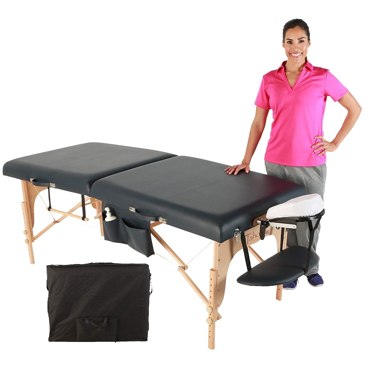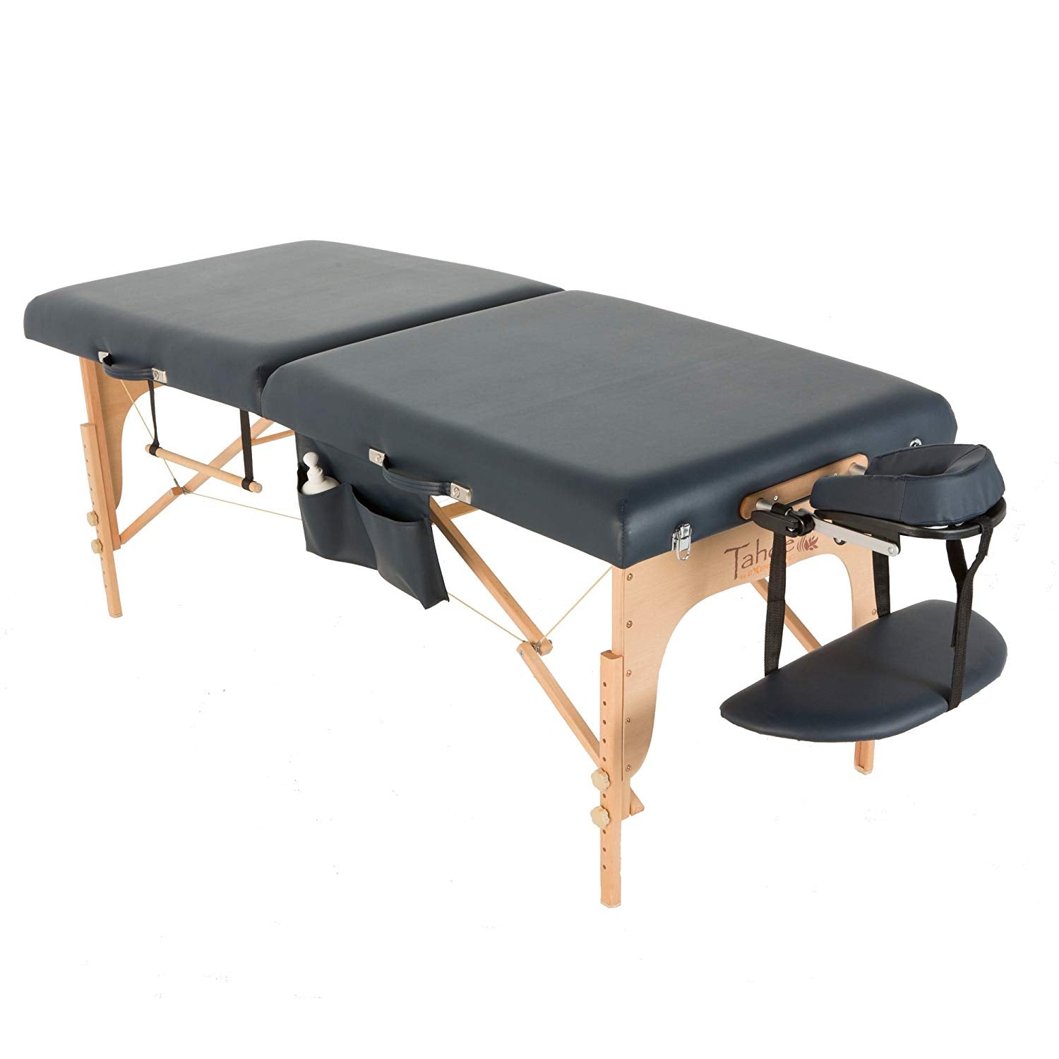 Made of European beech hardwood and water resistant PU leather upholstery, the Tahoe massage table is professionally designed to be 30" wide, with a luxurious 2.5 inches high density flame-retardant multi-layer foam. The table includes Reiki end panels, a towel rack and oil pouch, in addition to 3 reusable and washable 100% cotton face cushion covers. The Tahoe Massage table is covered with soft touch PU leather in a beautiful blue sapphire color. While not in use, the table can be folded and carried away with the included carry bag. Features: Professional size 30-inch wide folding massage table.
