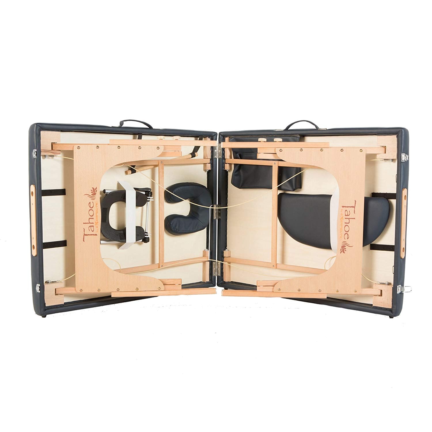 Made of European beech hardwood and water resistant PU leather upholstery, the Tahoe massage table is professionally designed to be 30” wide, with a luxurious 2.5 inches high density flame-retardant multi-layer foam. The table includes Reiki end panels, a towel rack and oil pouch, in addition to 3 reusable and washable 100% cotton face cushion covers. The Tahoe Massage table is covered with soft touch PU leather in a beautiful blue sapphire color. While not in use, the table can be folded and carried away with the included carry bag.
